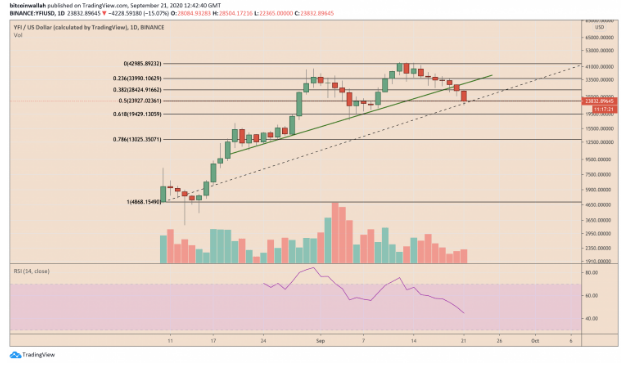 The YFI/USD dropped another 15 percent marking a $22,495 as its intraday low which brought the pair down by almost 48% from the all-time high. At the same time, the total value locked inside the pool of YFI moved to the $950 million and it is now on the verge of reaching a record level. The ballooning liquidity pool and the dropping prices expressed a major conflict between YFI’s fundamental and technical proponents. The $950 million worth of capital reserves shows that the users were choosing the coin for the leading aggregator services and the demand for the product also failed to excite the traders with the increasing exposure in the coin.