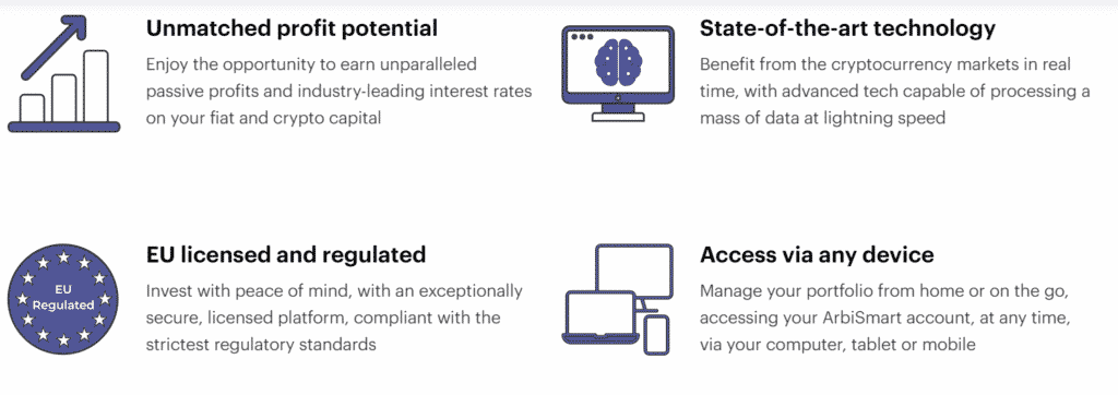 One of the best key features is that no prior investing knowledge or experience to use it is needed. This is because of the autonomous nature of the system which means all users can rely on the algorithm to do the heavy work for them and this exactly sets apart ArbiSmart from other crypto platforms.